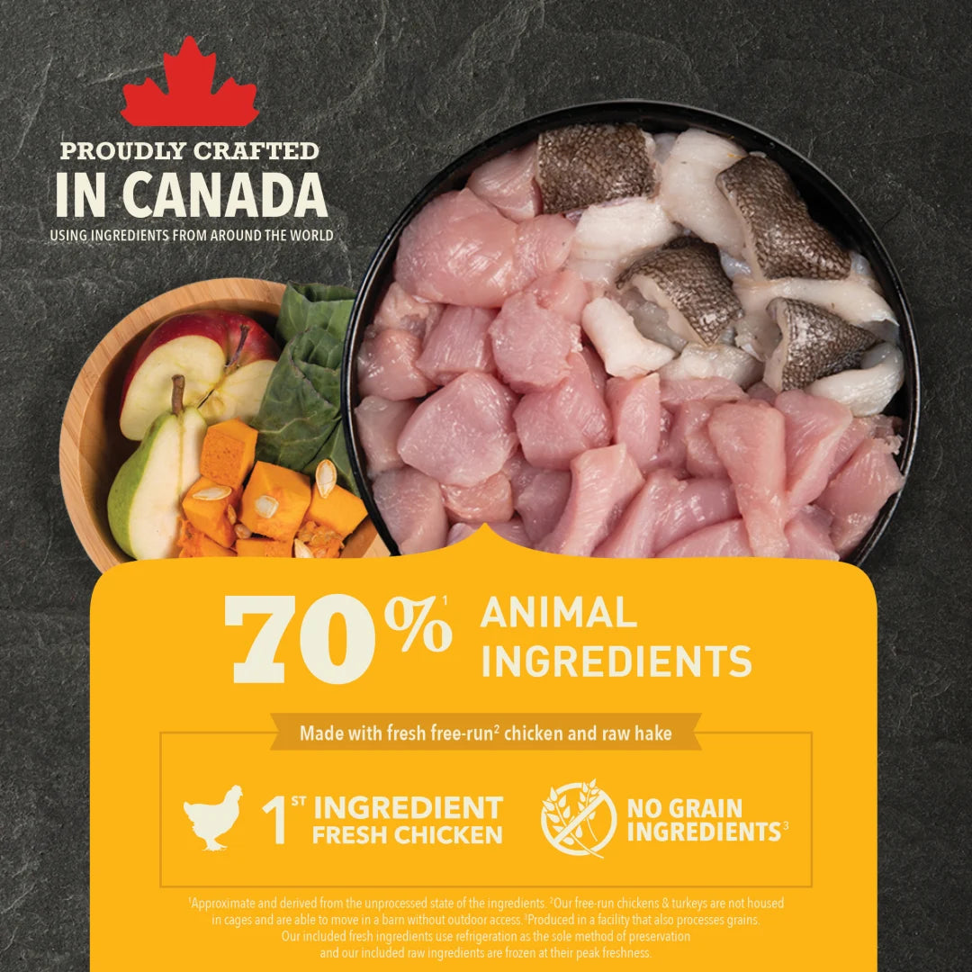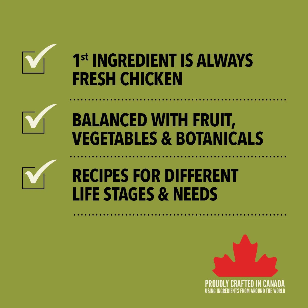 Fresh chicken (18%), chicken meal (18%), whole red lentils, whole green peas, fresh chicken giblets (liver, heart) (7%), chicken fat (7%), turkey meal (4%), eggs (4%), raw flounder (4%), herring meal (4%), fish oil (3%), whole green lentils, whole chickpeas, whole yellow peas, pea fiber, pea starch, raw turkey livers (1%), salt, dried kelp, fresh whole pumpkin, fresh whole butternut squash, fresh whole carrots, fresh whole apples, fresh whole pears, fresh whole zucchini, dried chicory root, fresh kale, fresh spinach, fresh turnip greens, fresh beet greens, fresh whole cranberries, fresh whole blueberries, fresh whole saskatoon berries, turmeric, milk thistle, burdock root, lavender, marshmallow root, rosehips ADDITIVES (per kg) Technological additives: With antioxidants. Nutritional additives: Choline chloride (choline): 700 mg, 3b606 (Zinc: 112.5 mg), 3b406 (Copper (II): 11mg), Vitamin B1: 25mg, Vitamin B5: 8 mg, Vitamin B6: 7.5mg, Vitamin A: 7500 IU, Vitamin D: 1000 IU, Vitamin E: 100 IU. Zootechnical additives: 4b1707 Enterococcus faecium NCIMB 10415 2.2x10^6 CFU.