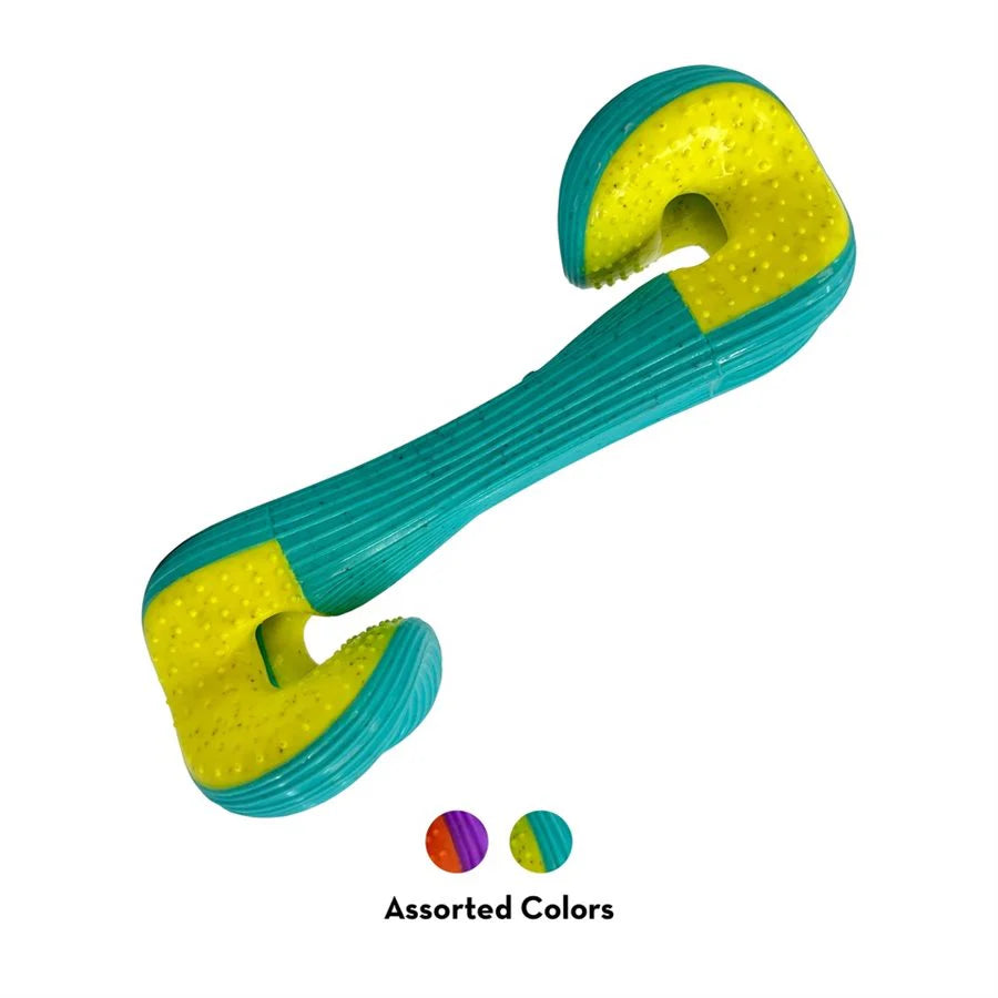 The KONG Rerun Whoosh Bone offers exciting fetch play with a built-in treat pocket to reward clever dogs. Its ergonomic shape makes it easy for dogs to grip, while textured nubs help clean teeth and massage gums during chewing. The distinctive whooshing sound triggers natural instincts, and the unpredictable bounce keeps fetch sessions lively. Crafted from 51% recycled materials, this toy provides eco-friendly fun that both you and your dog can feel good about.